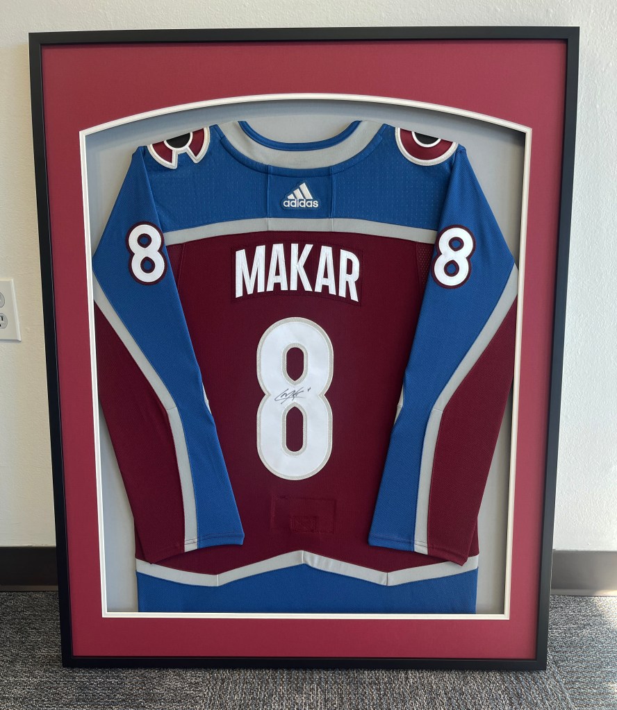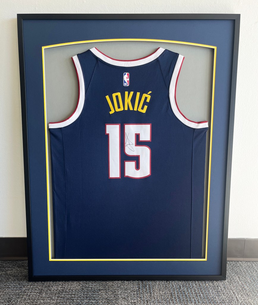 Hockey jersey shadow box with lifted double mat.
