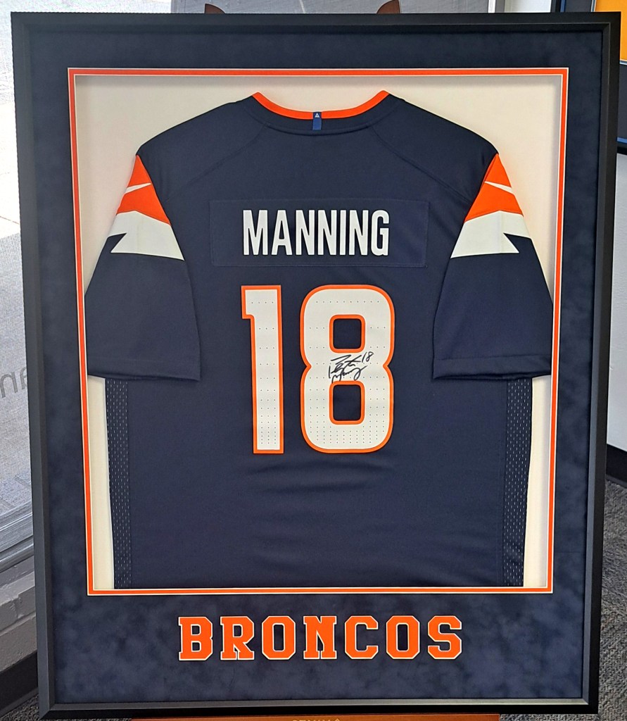 Signed Payton Manning Broncos jersey shadow box with suede mats and custom cut out letters.