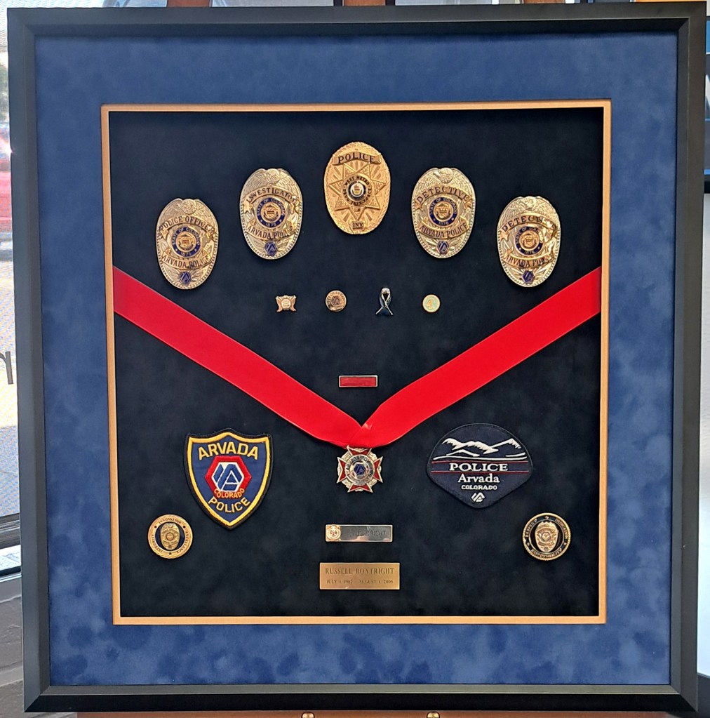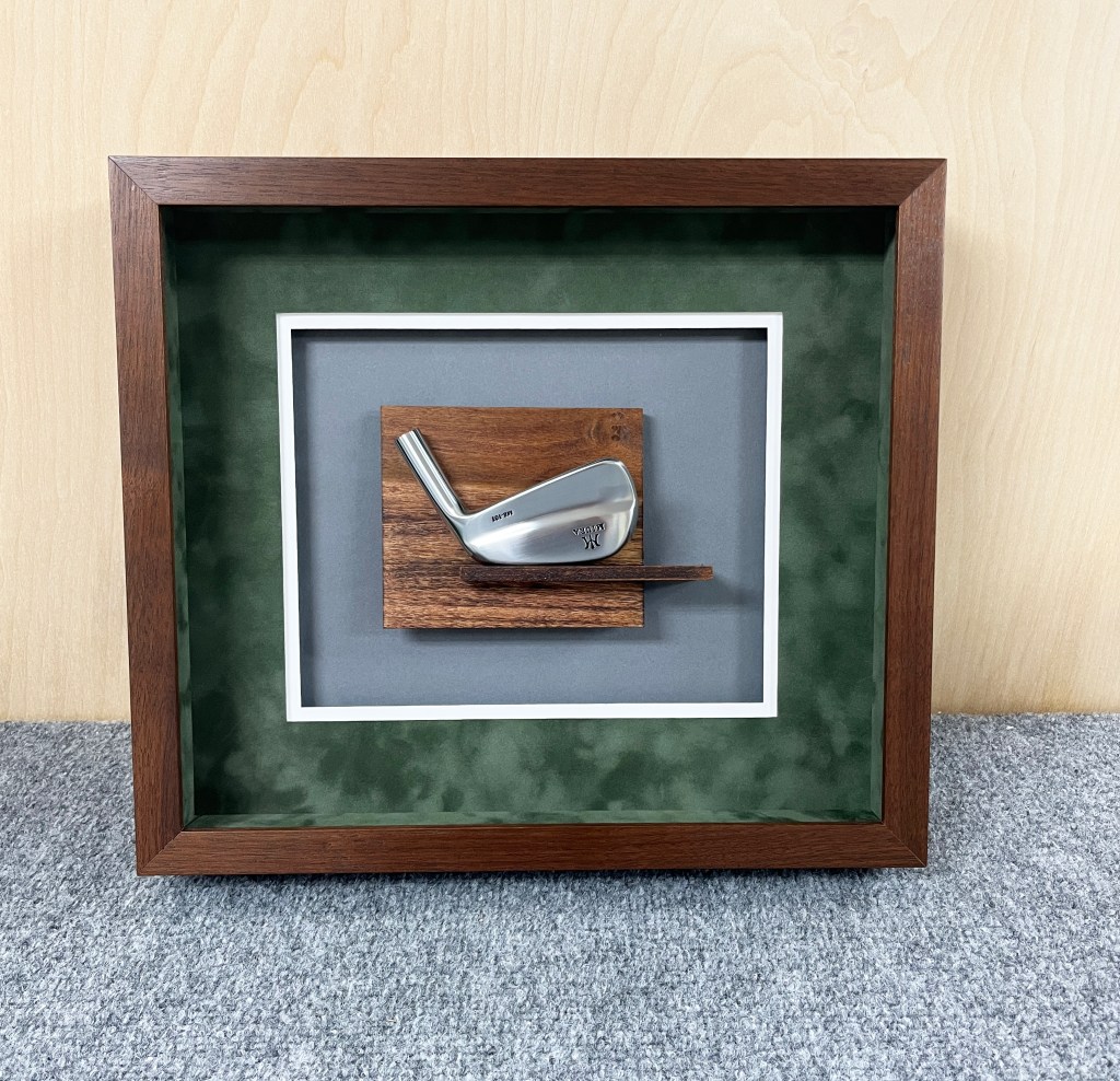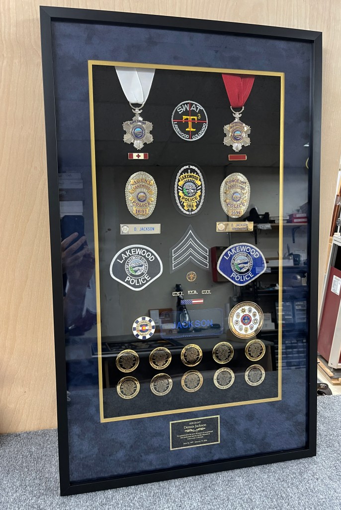 Retirement shadow box with suede mats.