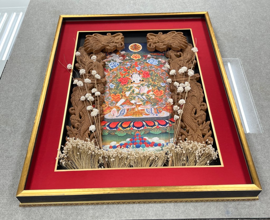 White Tara Tibetan thangka painting with sandalwood carved dragons shadow box.